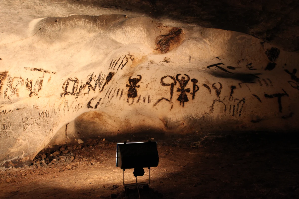 The walls of the cave display drawings from several historical periods, created using bat guano. The earliest paintings date back to the Late Paleolithic, with others from the Neolithic and the Bronze Age (between 3000 and 1200 BCE). The images predominantly depict hunting scenes, a solar-lunar calendar, and fertility symbols. Most are grouped compositions, though individual figures also exist. Some drawings appear in relief due to natural erosion of the rock beneath them.